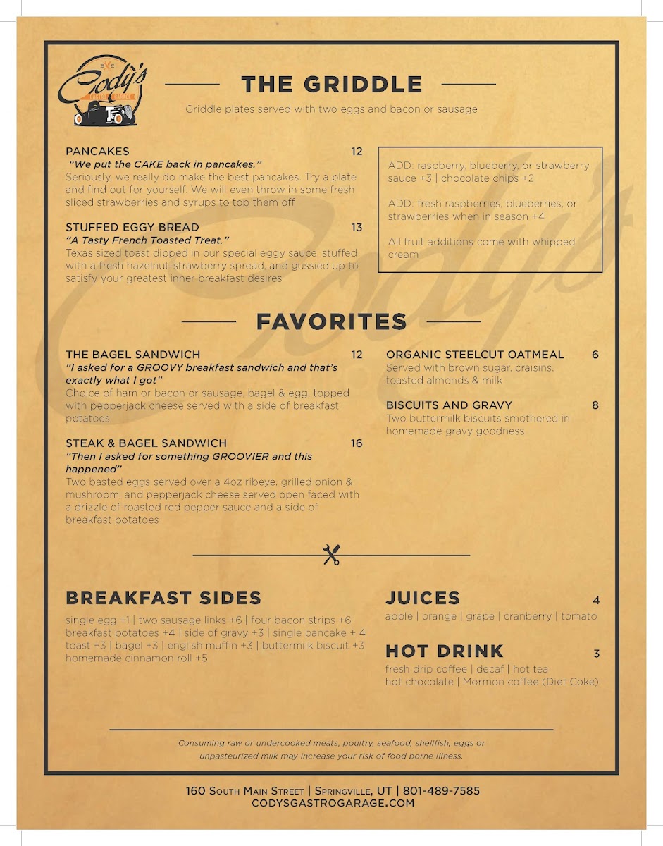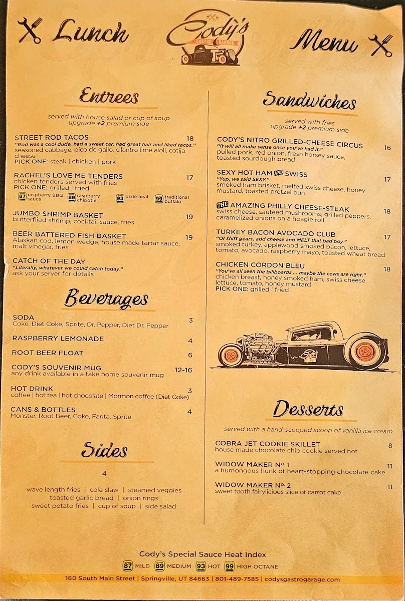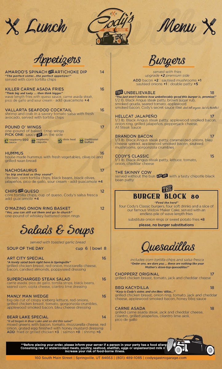 Welcome to Cody's Gastro Garage, a culinary gem nestled in the heart of Springville, Utah! This family-owned establishment combines a vibrant atmosphere with a menu that delights the senses. Among the highlights are the Kaceydilla, a unique BBQ quesadilla that has garnered rave reviews, and their famous beer-battered fries, praised for their exceptional flavor. Burger enthusiasts will be thrilled with the selection, as customers have described Cody's burgers as "fresh" and "delicious."